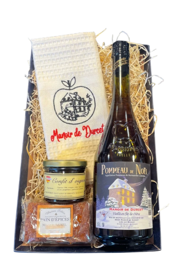 panier composé d’un pommeau de Noël, torchon brodé, confit d’oignons, pain épices.